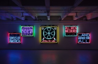 Currently at Charlie James Gallery in Los Angeles, Patrick Martinez has a new versatile body of work on display entitled All Season Portfolio. The new pieces presented range from his signature hip hop influenced (now with socially conscious slogans) neon signage to his newer series satirizing Pee Chee Portfolios of our youth, oftentimes replacing the athletes with victims and imagery of police brutality, Take a look at more photos from the exhibition below and visit for yourself before it closes on February 18th. Via ARTnews. Discuss this show here. Discuss Patrick Martinez here.