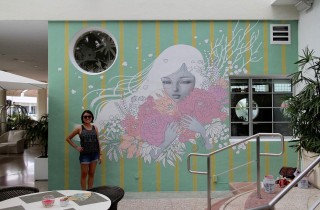 After about almost a week of painting, Audrey Kawasaki (interviewed) has completed her contribution to Basel Week Miami – a stunning mural at the Hotel of South Beach. The piece featuring one of her seductive muses surrounded by blooms is part of this year’s “Fearless Walls” curated by Goldman Global Arts // Jessica Goldman. Head over to see her handiwork yourself if you are in town for the festivities as well as check out some of the in-progress photos below… Photo credit: @sashabogojev for Arrested Motion. Discuss Basel Week Miami here. Discuss Audrey Kawasaki here.