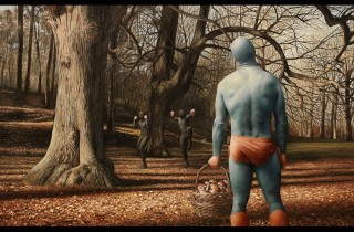 After completing a clever two wall mural in Berlin, Andreas England is getting ready to open a solo show on June 17th at Ramhuset in his hometown. The Swedish artist has prepared some of the humorous oil paintings depicting the everyday life of an anonymous superhero that he is known for, including a series he calls Superfly. You can also see some work at Restaurant Smak in Falun all summer. Discuss Andrew England here.