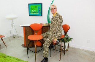 Last week in Los Angeles, Shag (interviewed) brought a little retro chic to the new Corey Helford Gallery location with his latest solo entitled Jungle Drums. Along with his signature paintings featuring a nostalgic look back when mod characters hung out sipping martinis, the downtown LA showspace also featured tiki sculptures, a mid-century decor, as well as a large wall covered with his imagery. Photo credit: Birdman Photos. Discuss Shag here.