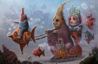 On October 10th, Matt Dangler (interviewed) will be opening a new solo at Copro Gallery, the site of his showing in Los Angeles in 2012 (covered). Entitled Sanctify, the title is perhaps a hint at some of the heavier topics that the gifted painter will be exploring with his surreal vision. An example of what to expect can be seen in the piece above, The Promised Land, as well as in the preview images below. Discuss Matt Dangler here.