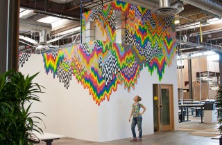Continuing to go big with her art, Jen Stark recently completed an installation for the new Facebook building in the Bay Area. With a team of assistants by her side, the Los Angeles-based artist left here colorful make on the inside of the Gehry building for the Facebook Artist in Residence program. The multi-layered psychedelic colors seem to drip down from the edges of the indoor structure mirroring the imagery seen in her gallery work. More photos below… Discuss Jen Stark here.
