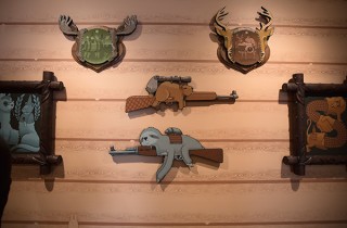 Last night, Hunting Trophies opened at the Mark Moore Gallery, Jeremy Fish’s (featured) second solo with the Culver City space. Continue using custom shapes as his painting surface as well as elaborate frames with carvings, the pieces have a finished look about them and with the impeccable linework, appear almost produced in a factory. Along with wall graphics. the room that housed the paintings looked like a surreal hunting lodge. Check out more photos below… Photo credit: NOTCOT. Discuss this show here. Discuss Jeremy Fish here.