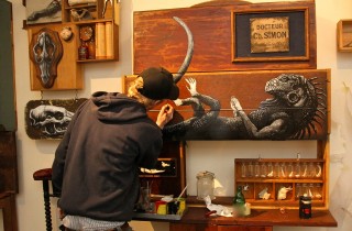 Tonight in Belgium, favorite son ROA will be opening a show at Bodson-Emelinckx in Brussels. Entitled Stop Over, this exhibition will finally give fans in his home country a look at his special anatomical style. As usual, the prolific street artist is keeping things close to the vest but here are a couple sneak peaks at what he is working on. Photo credit: Henrik Haven. Discuss ROA here.