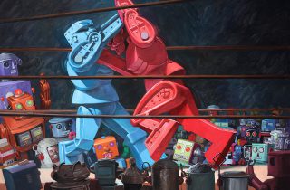 Continuing his annual showings at Corey Helford Gallery in Los Angeles, Eric Joyner (interviewed) will be returning for another solo on June 23rd. Cleverly entitled Glazed Machinations, the new body of work perfectly encapsulates what inspires him to paint – robots and donuts. Whether it be his signature Rock ‘Em Sock ‘Em Robots or incorporating the iconic Randy’s Donuts into his imagery, Joyner always finds novel new adventures for his two “muses” as well as unique ways for them to interact. Discuss Eric Joyner here.